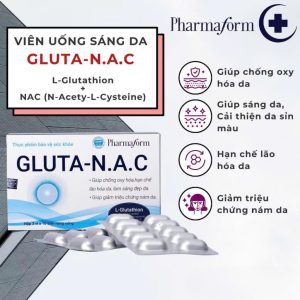 Pharmaform GLUTA-N.A.C là thực phẩm bảo vệ sức khỏe (TPBVSK), được bào chế với công thức mạnh mẽ, hỗ trợ chống oxy hóa, hạn chế lão hóa da và làm sáng da từ sâu bên trong. Sản phẩm đặc biệt hữu ích cho những người trưởng thành muốn cải thiện làn da, làm mờ các triệu chứng nám và duy trì vẻ đẹp tươi trẻ. Với sự kết hợp của các hoạt chất quan trọng như L-Glutathion, N-acetyl-L-cystein (N.A.C), Vitamin C, Vitamin E và các chiết xuất thực vật, GLUTA-N.A.C hỗ trợ nuôi dưỡng làn da, giúp da trở nên khỏe mạnh, rạng rỡ và đều màu hơn.